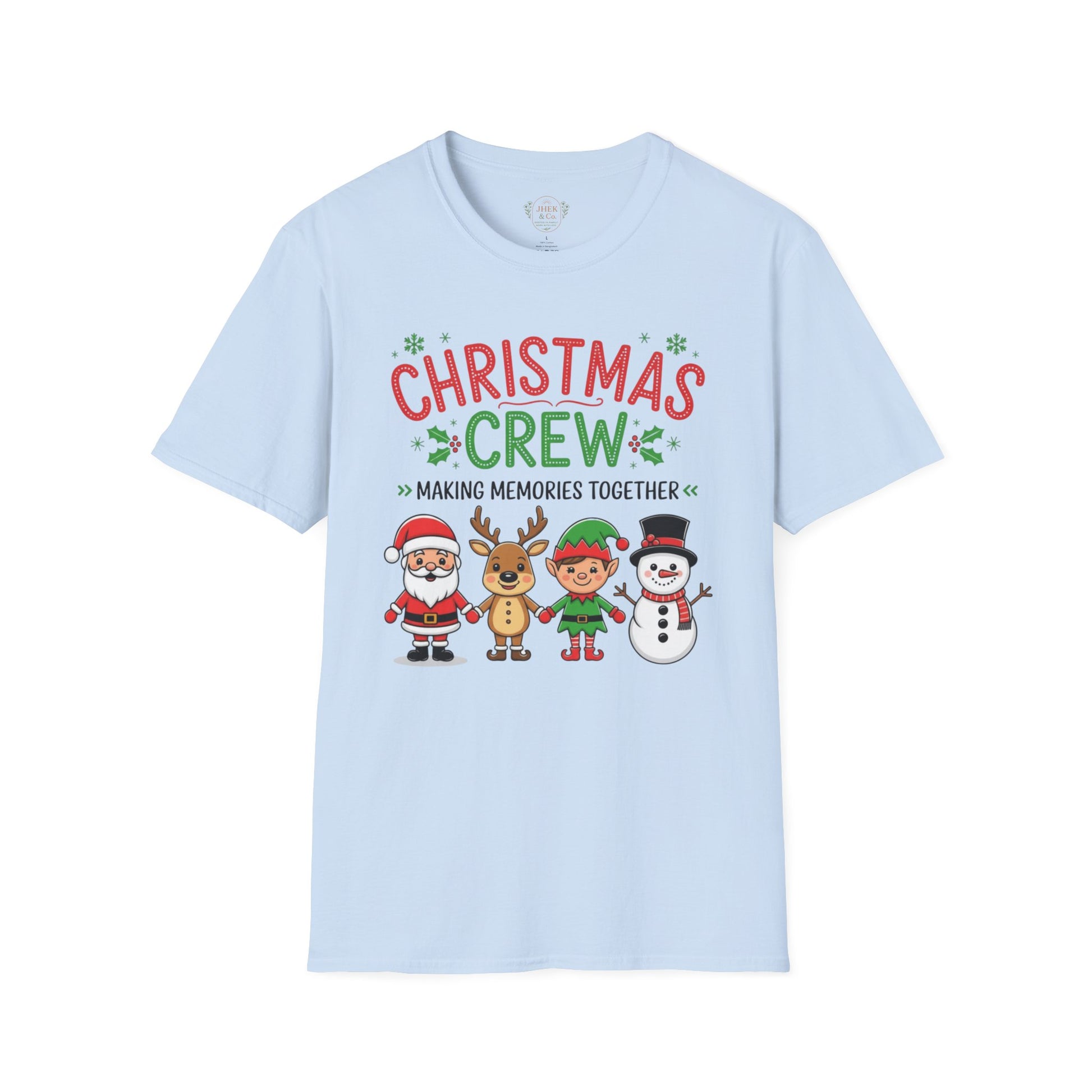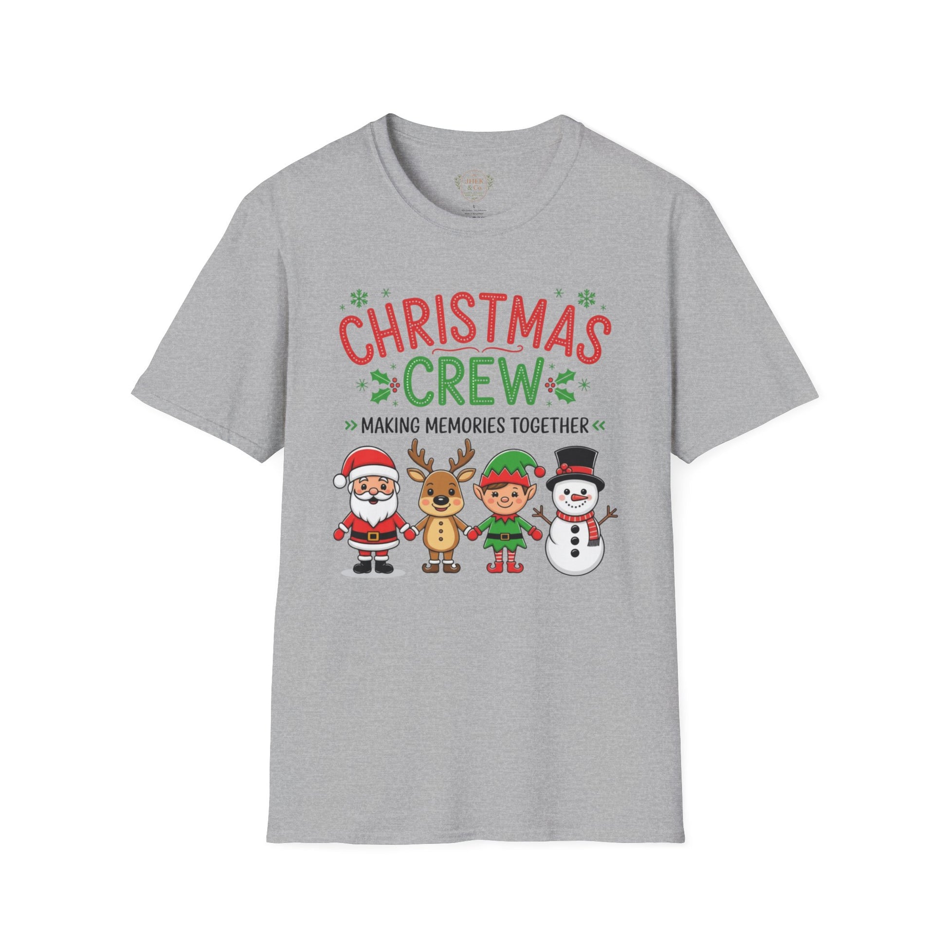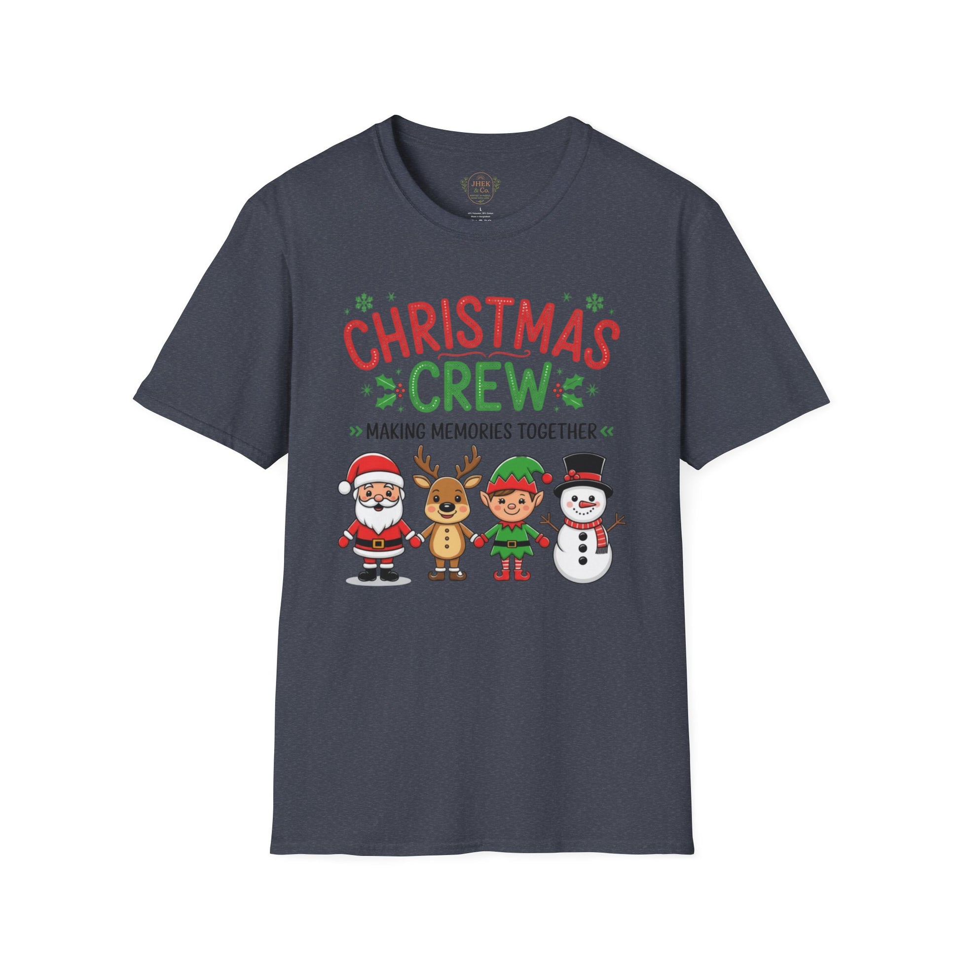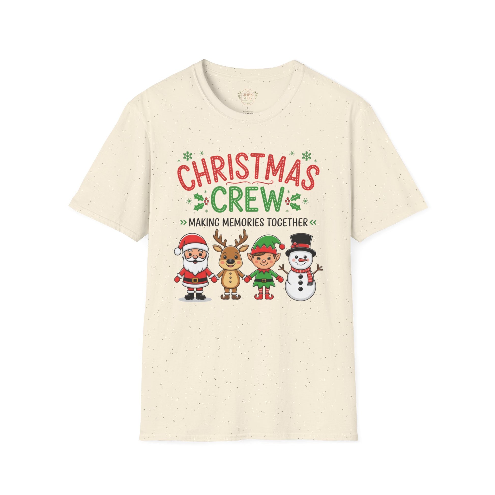 Bring the whole crew together this season with the softest, most cheerful holiday tee. This lightweight, ring-spun cotton shirt features a playful “Christmas Crew — Making Memories Together” graphic starring Santa, a reindeer, an elf, and a snowman — all illustrated in bright, friendly colors that feel festive without being over the top.