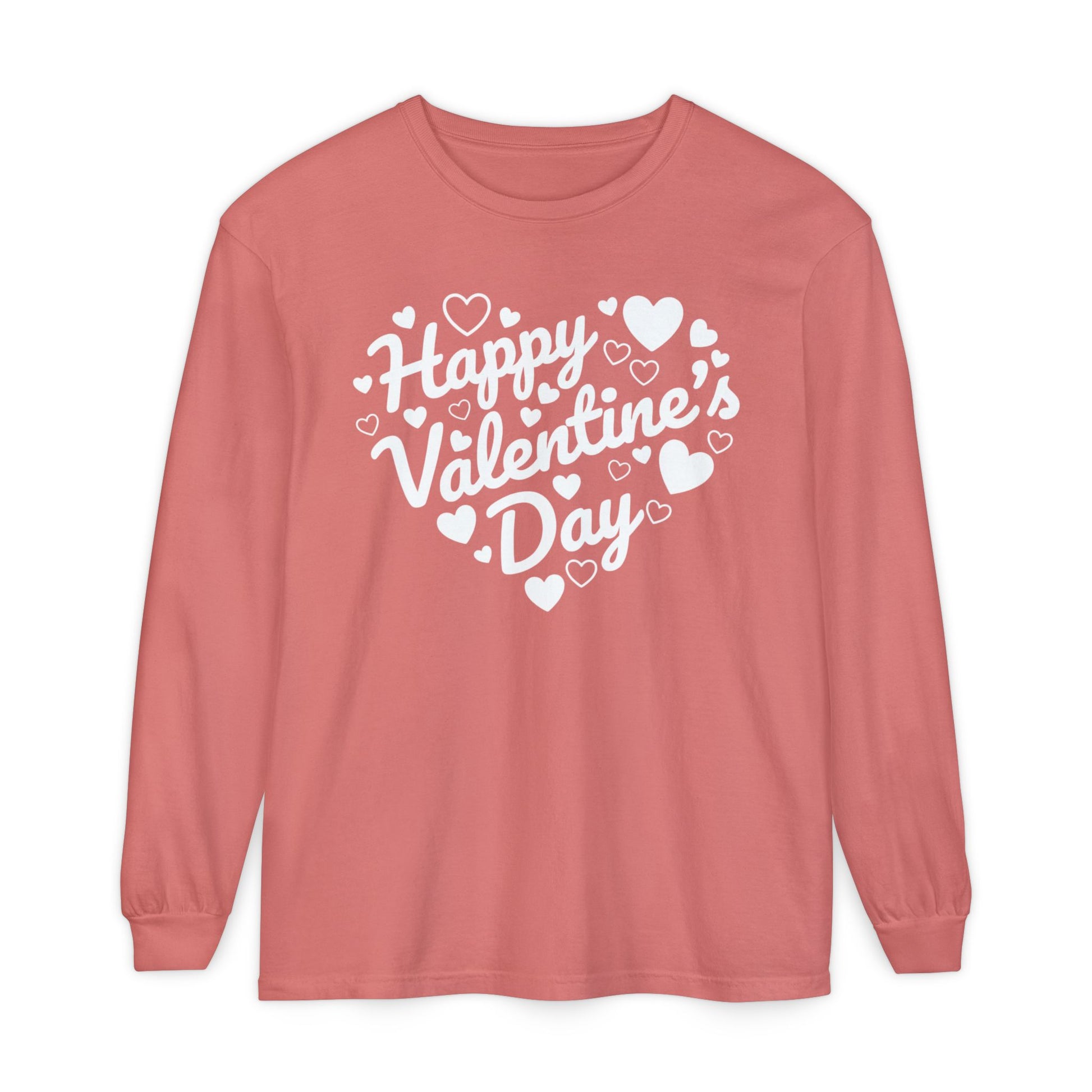 Soft, lived-in comfort meets sweet Valentine charm in this long sleeve tee. Made from garment-dyed ring-spun cotton, this Comfort Colors shirt has that perfectly broken-in feel you love from the very first wear. The hand-lettered “Happy Valentine’s Day” design is arranged in a heart shape and surrounded by playful little hearts, giving it a warm, festive feel without being over the top.