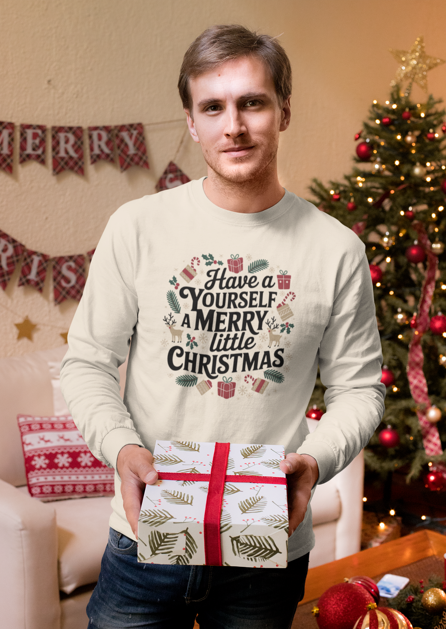 Bring the holiday spirit to life with this festive long sleeve shirt! Featuring the classic phrase “Have Yourself a Merry Little Christmas” in charming vintage typography, surrounded by hand-drawn holiday details like wrapped presents, holly leaves, candy canes, and reindeer — it’s the perfect blend of nostalgic and cozy.