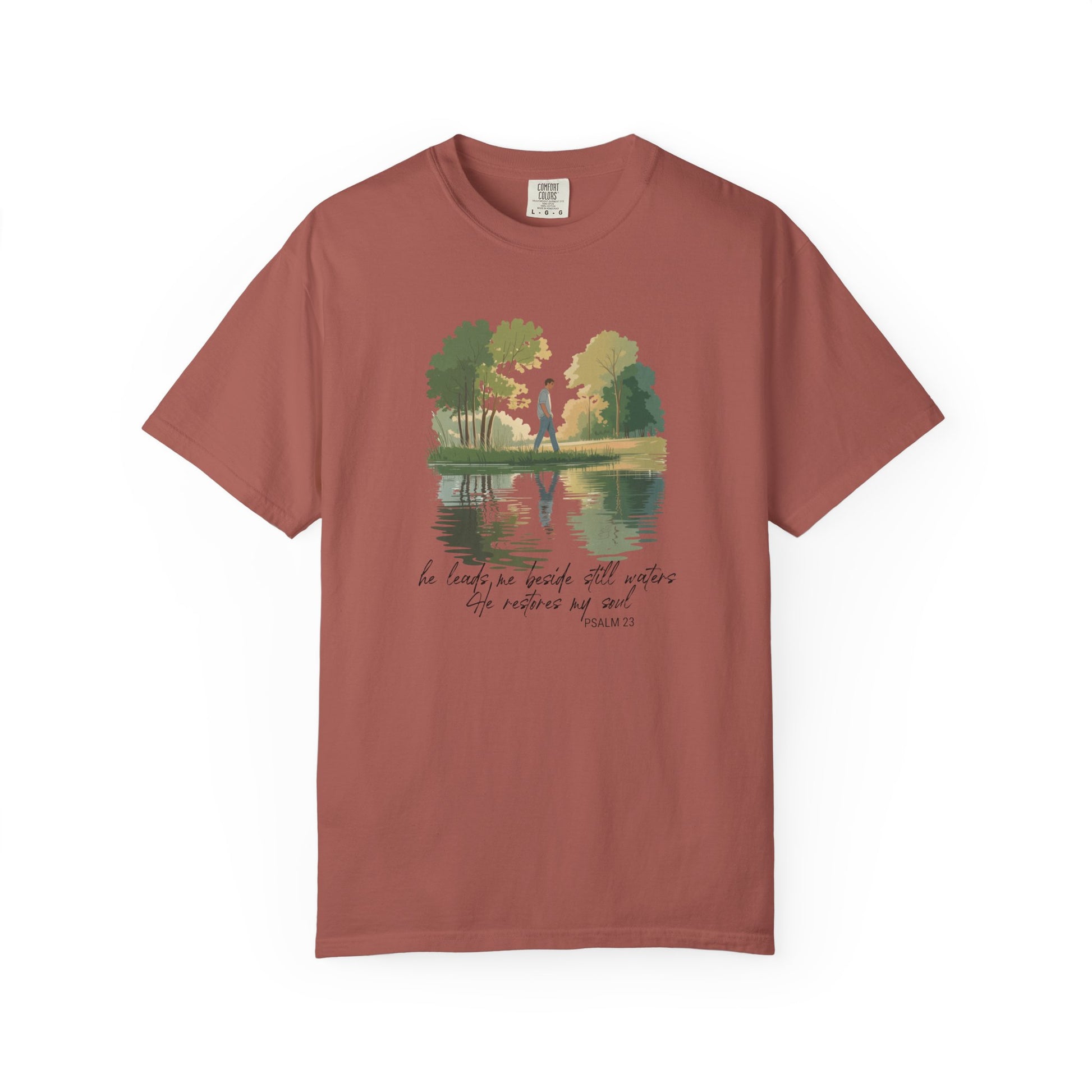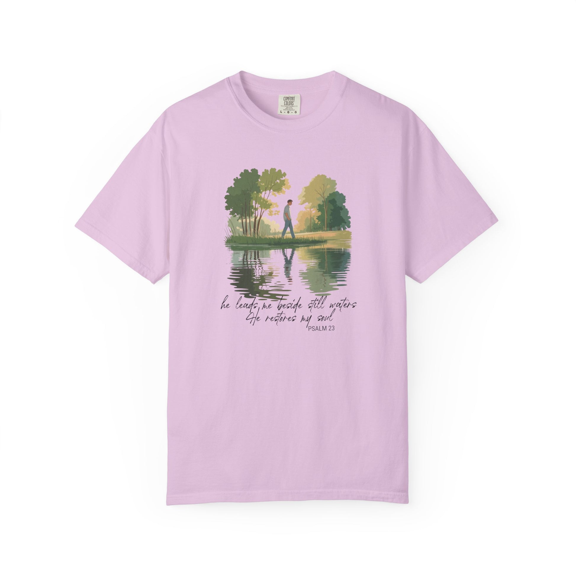 A soft, garment-dyed tee that captures a moment of stillness and peace. The artwork on the front shows a man walking quietly by a calm pond, his reflection mirrored in the water and framed by trees bathed in warm, gentle light. Below, the verse reminds us that faith often leads us toward calm and renewal — “He leads me beside still waters.”