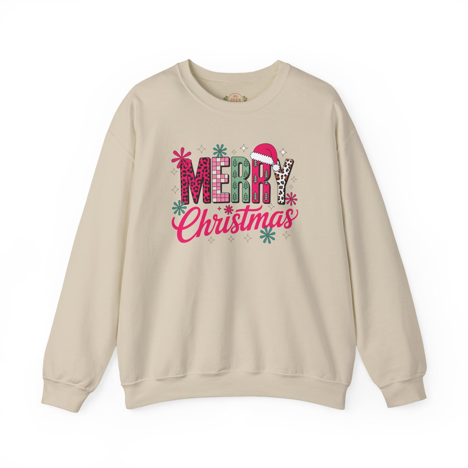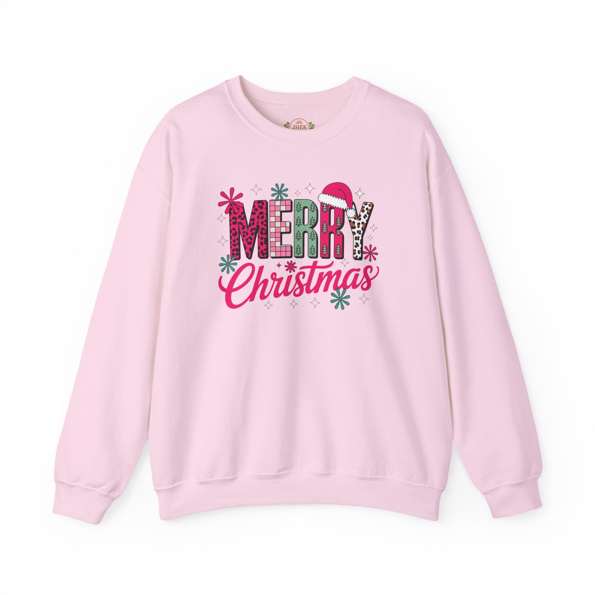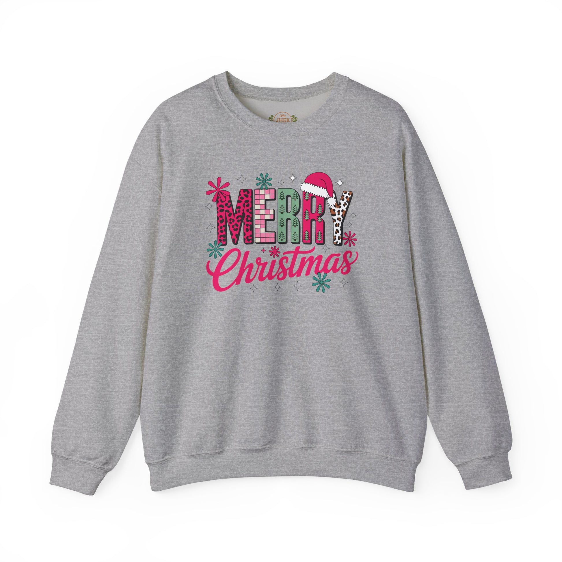Bring cheerful holiday energy to every cozy moment with this bold and festive crewneck. The design features a playful mix of patterns—leopard print, buffalo check, mini Christmas trees, and a Santa hat—spelling out “MERRY Christmas” in bright, joyful colors that pop against the fabric. It’s fun, modern, and the perfect balance of trendy and nostalgic, making it an instant favorite for holiday photos, parties, school events, and Christmas morning alike.